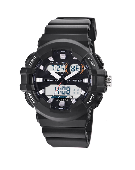 The Activa × Invicta Digital Men’s Watch (50 mm) features a bold 50 mm black-tone case, matching black strap, and a digital display offering stopwatch, dual-time and alarm functions. Water resistant to 30 m (3 ATM), this watch brings modern digital style with everyday practicality.