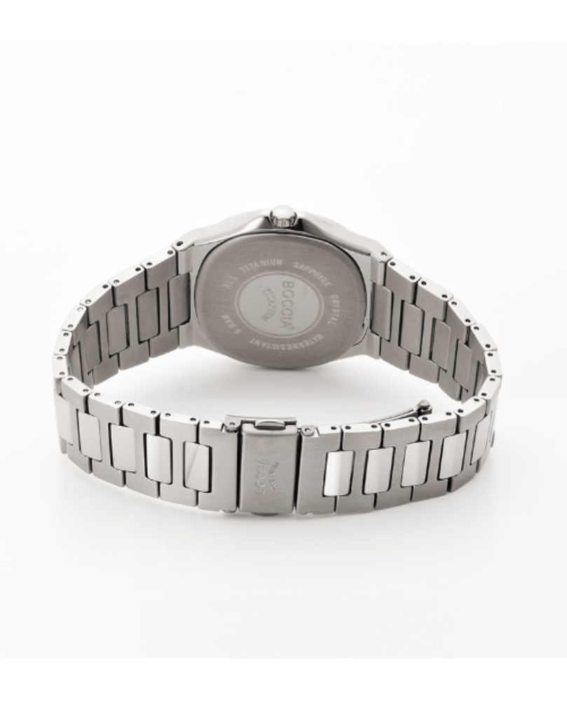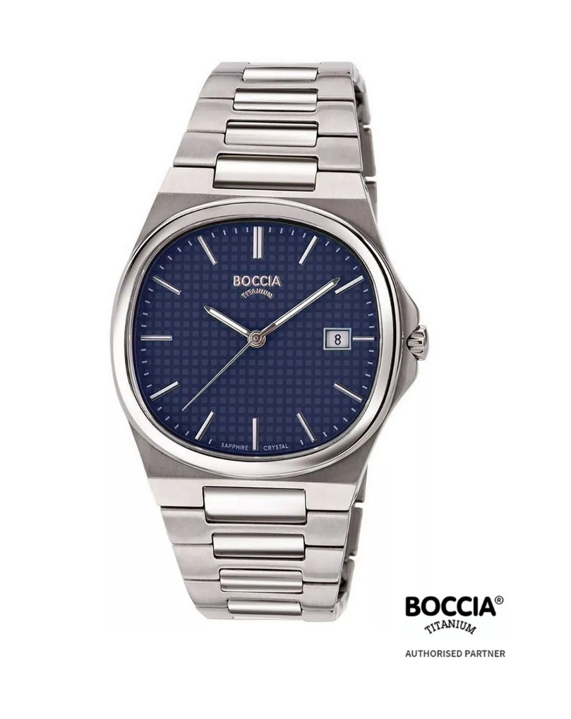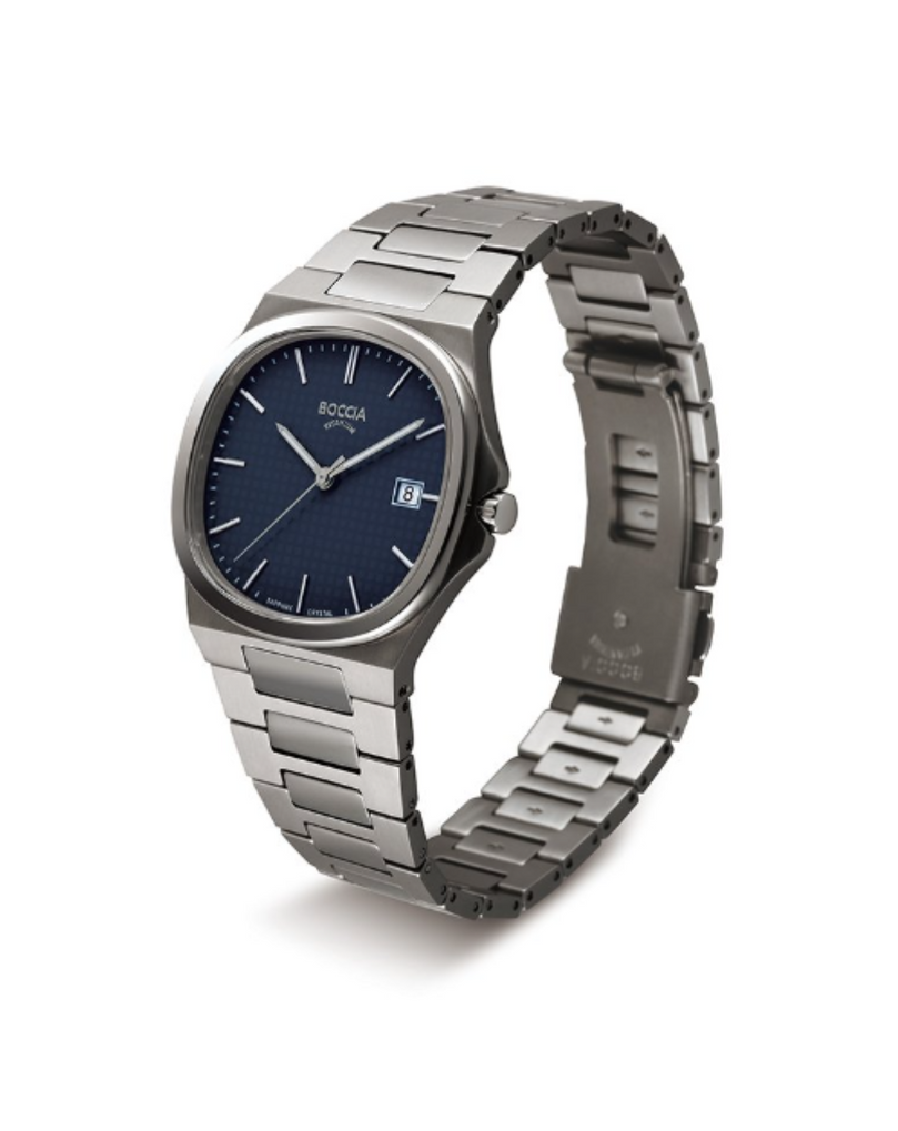 The Boccia Titanium 3657‑02 is a sleek, men's/unisex watch made entirely from lightweight, hypoallergenic titanium. It features a cushion-shaped 39 mm case and matching bracelet, a deep blue dial with minimal bar indices and a date window, and a scratch-resistant sapphire crystal. With 5 ATM water resistance and precision quartz movement, it combines contemporary elegance with everyday practicality.
