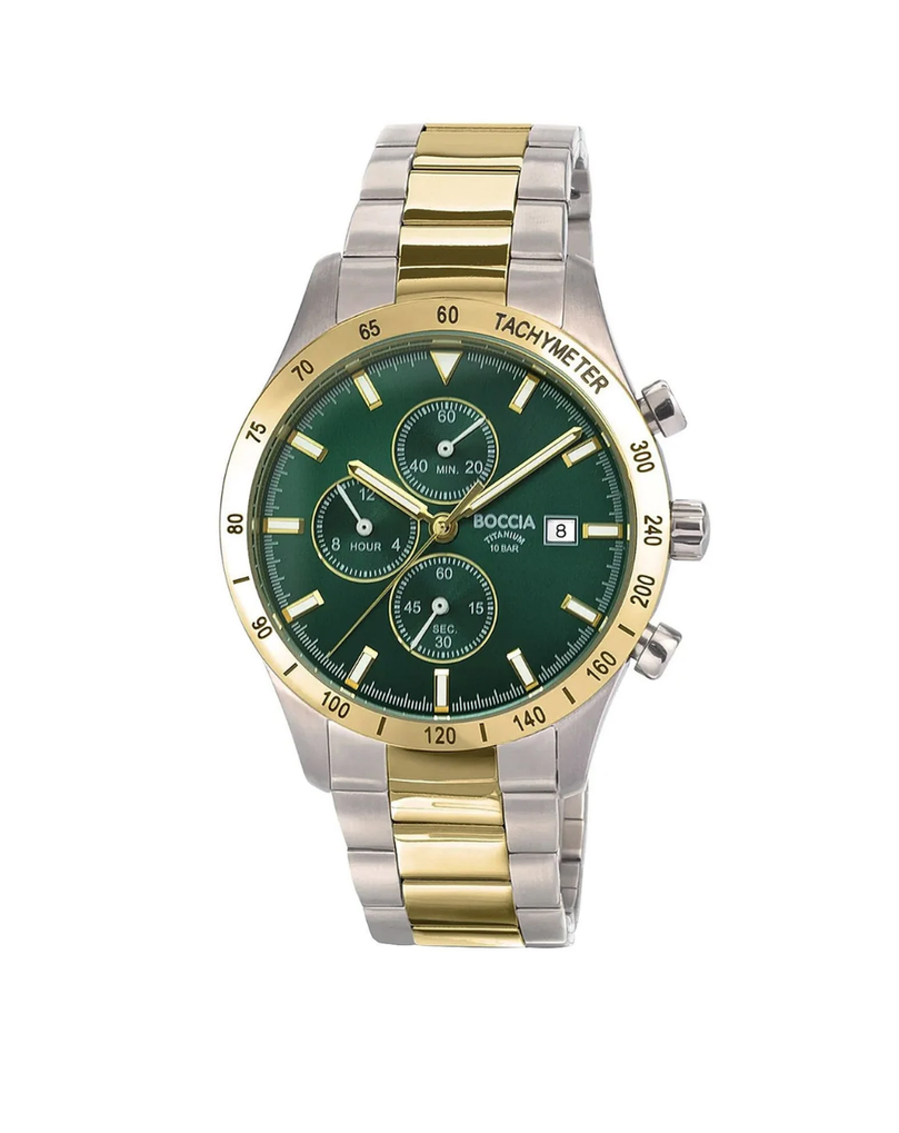 The Boccia 3739-05 blends sport and elegance with a striking green dial, gold highlights, and a durable, feather-light titanium build. Featuring full chronograph functionality, date display, and 100m water resistance, it’s a standout piece built for daily wear with refined flair.