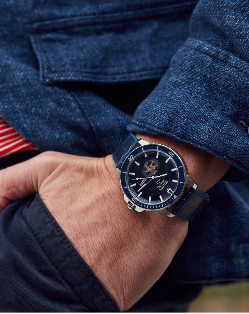 Style Highlights: Bold skeleton look, open-heart movement view, tough Marine Star build, sporty steel finish