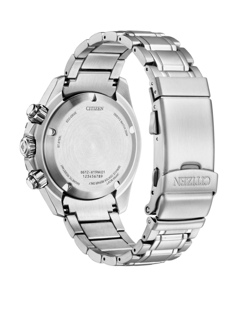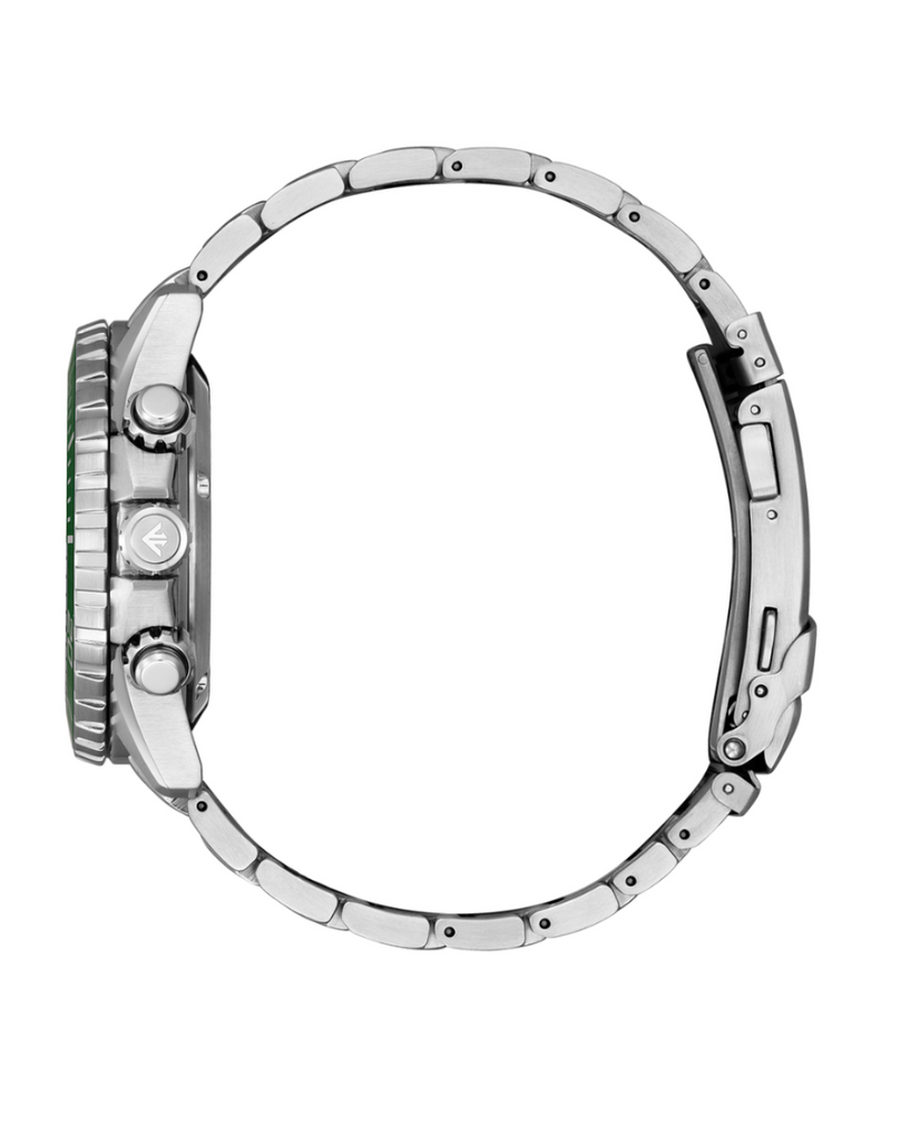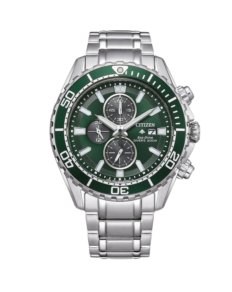 The Citizen Promaster CA0820-50X is a rugged 45mm men’s chronograph dive watch powered by Eco-Drive (no battery needed). It features a green dial, stainless steel case and bracelet, 200m water resistance, 1/5-second chronograph, and a date display. Built for both land and sea, it's stylish, durable, and ready for adventure.