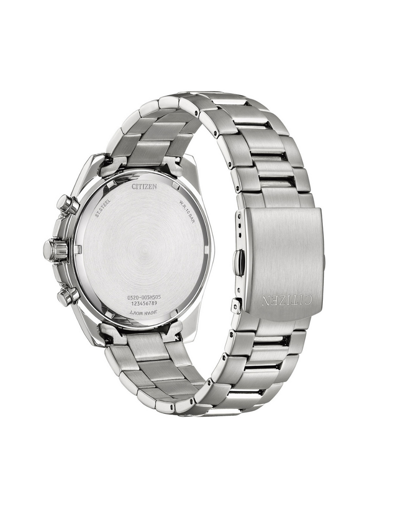 "Sporty quartz chronograph with stainless steel case and bracelet, crystal glass and dark blue dial. Equipped with caliber 0520 with stopwatch function, 24-hour display, date and 10 bar water resistance. Case diameter: 44 mm, strap lug width: 22 mm." - From Citizen EU website.