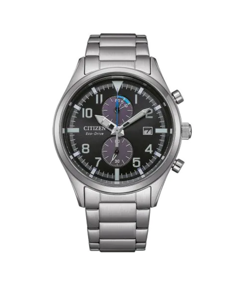 Function: Eco-Drive (solar-powered), date display, chronograph up to 60 minutes in 1/5-second increments, battery discharge indicator, 210-day power reserve