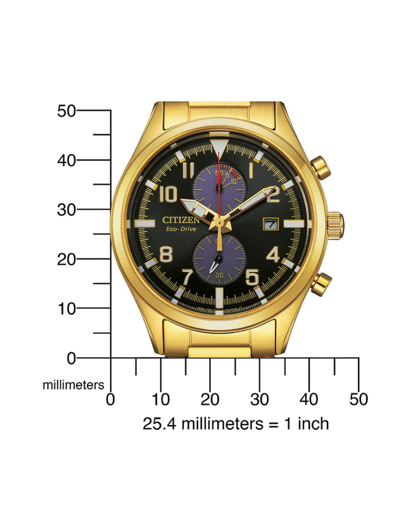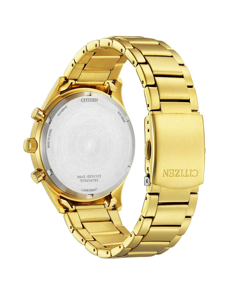 The Citizen CA7022-87E merges classic chronograph styling with eco-friendly solar technology. Housed in a 43 mm gold-tone stainless steel case, it features a striking black dial with Arabic numerals, three sub-dials, and a polished tachymeter bezel. Powered by Eco-Drive (Caliber B642), it charges in any light for up to 210 days of power reserve, and resists up to 100 m of water—practical luxury for everyday wear.