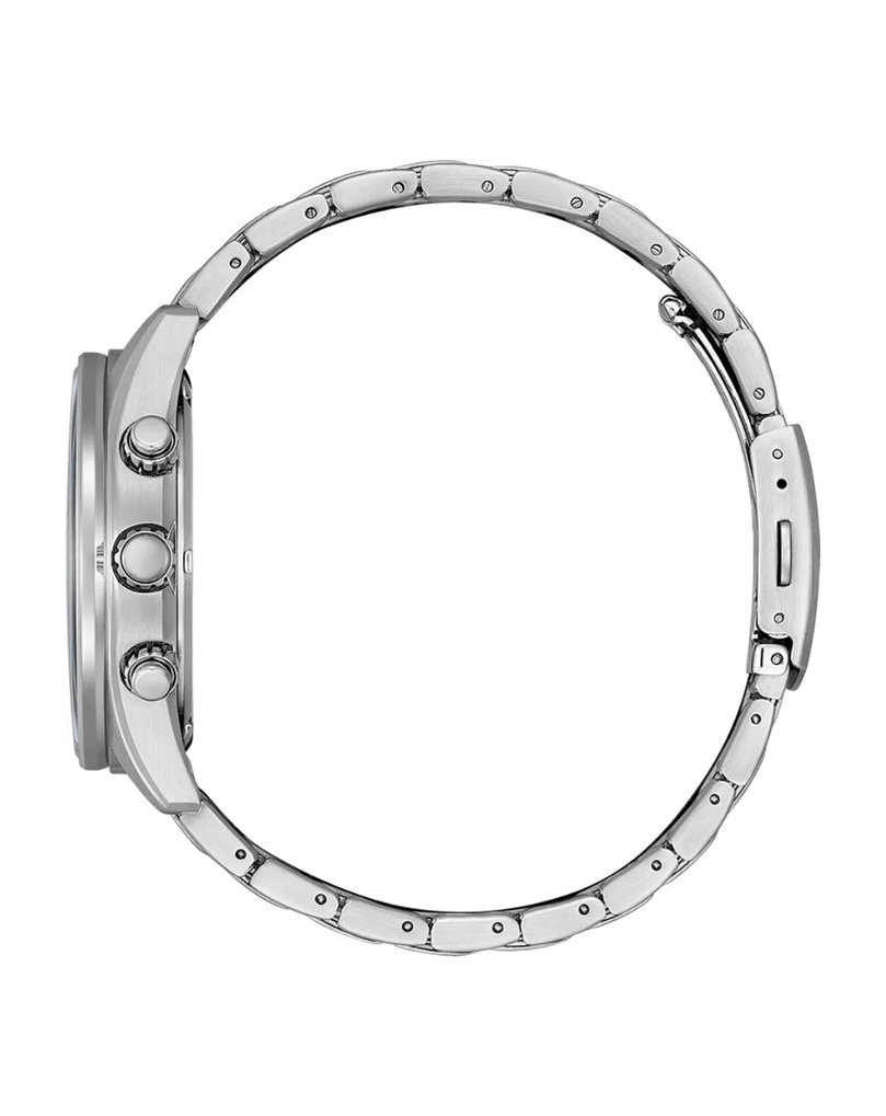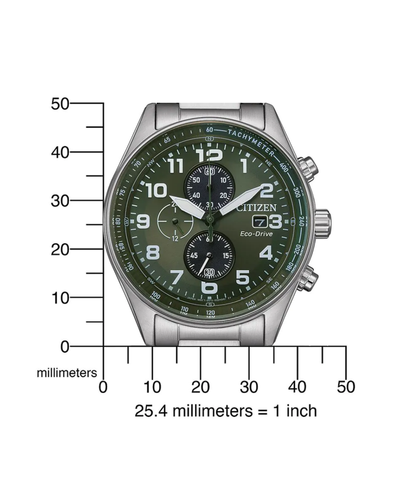 The Citizen CA0770-72X combines eco-friendly solar technology with bold chronograph design. Featuring a 43 mm stainless steel case, green dial with Arabic numerals, tachymeter bezel, and three sub-dials, it delivers both precision and style. Powered by Citizen’s Eco-Drive Caliber B612, it charges in any light and offers up to a 210-day reserve, making it a durable everyday companion with water resistance up to 100 m.