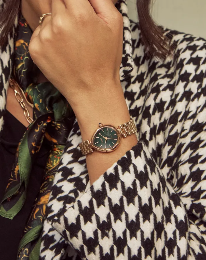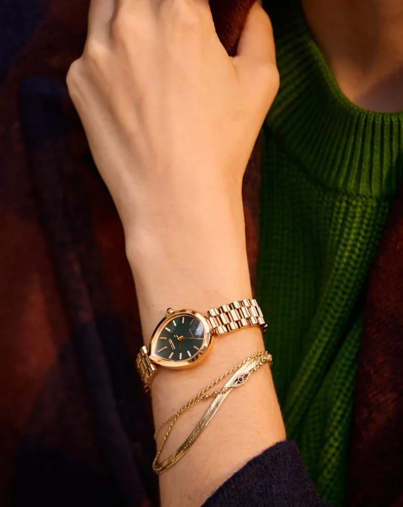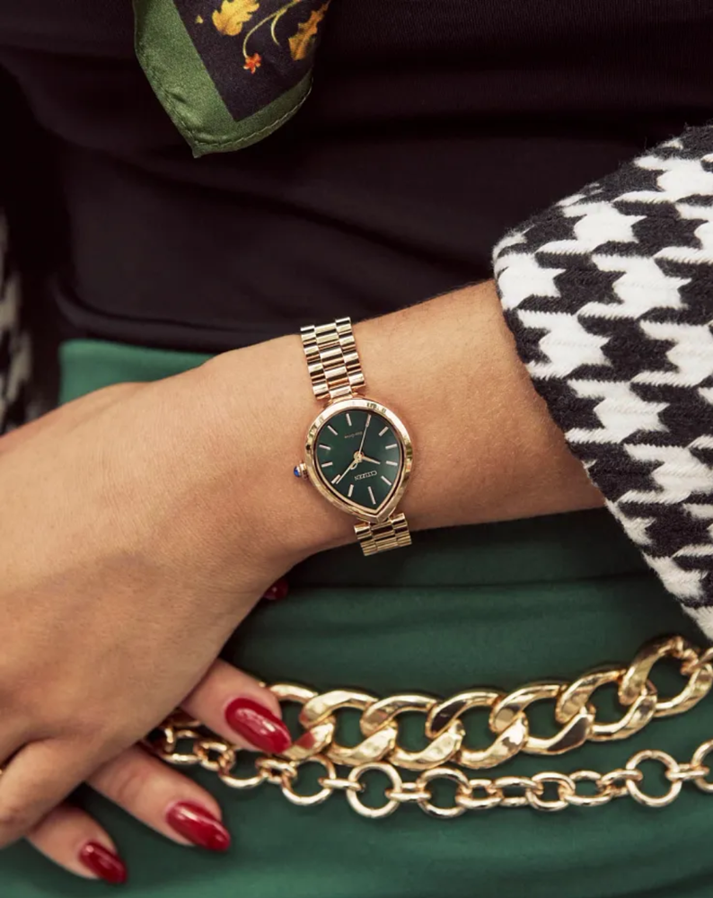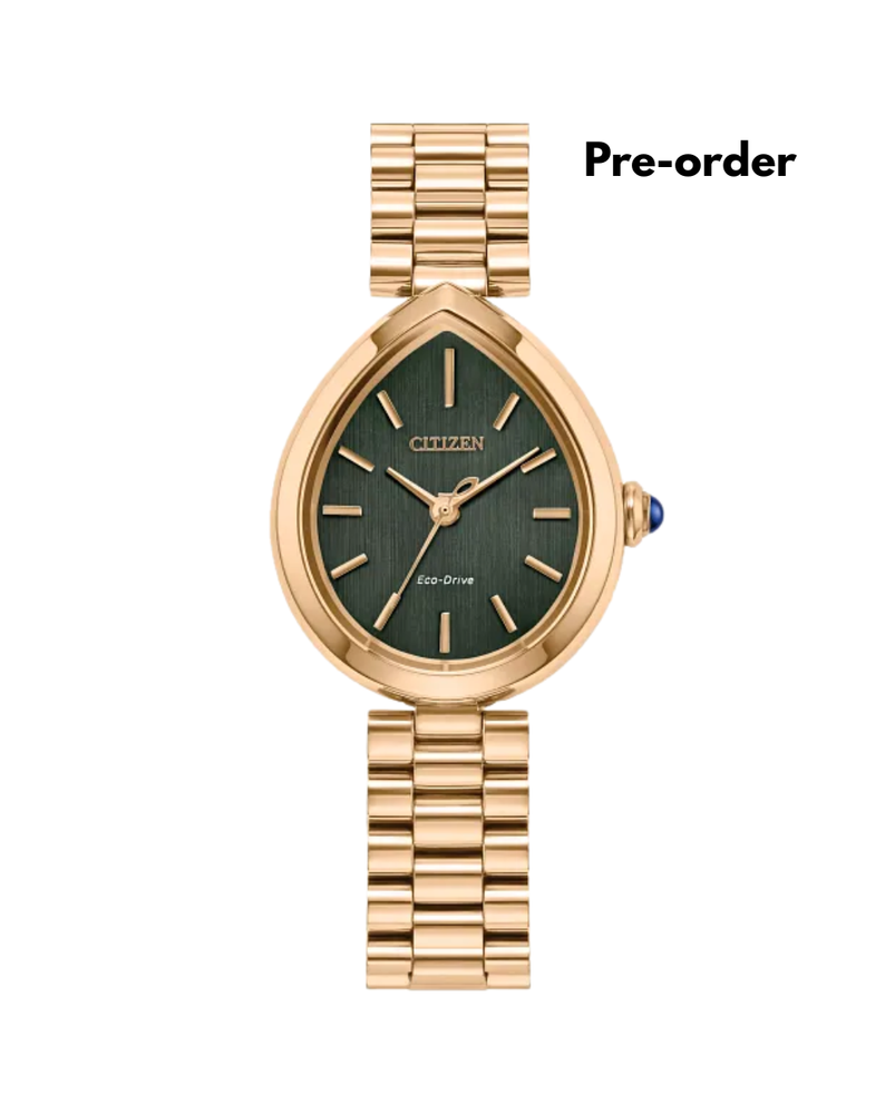 Style Highlights: Elegant gold-tone finish, rich green dial pop, slim everyday dress style with Eco-Drive convenience
