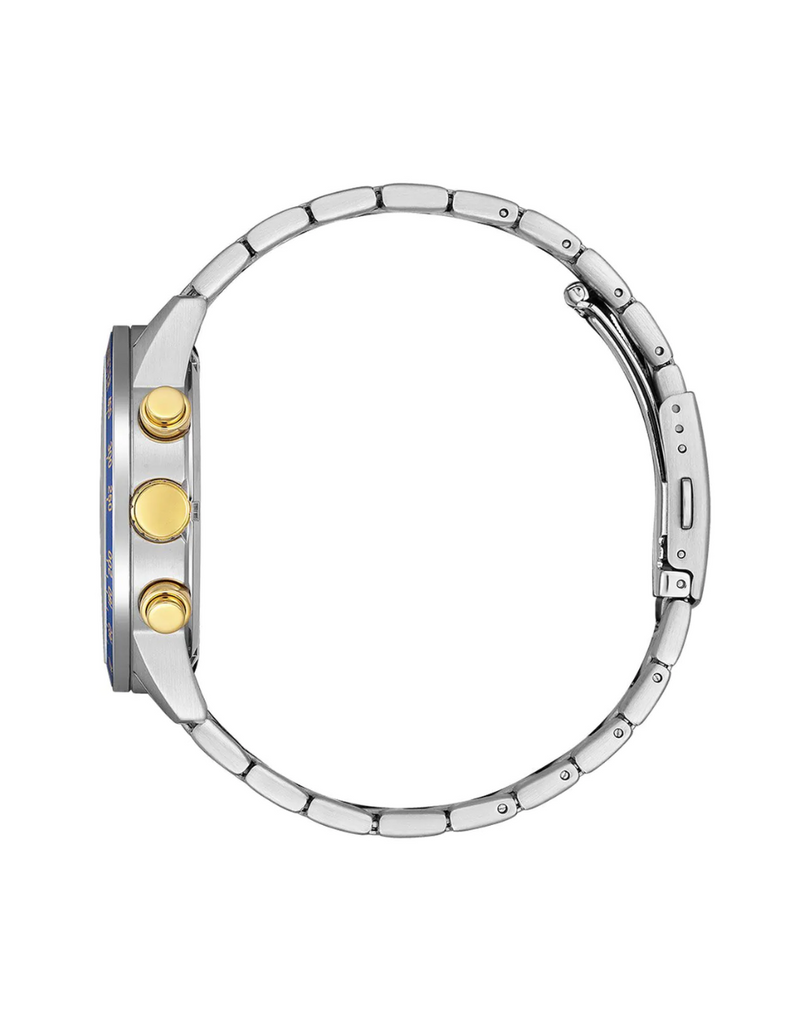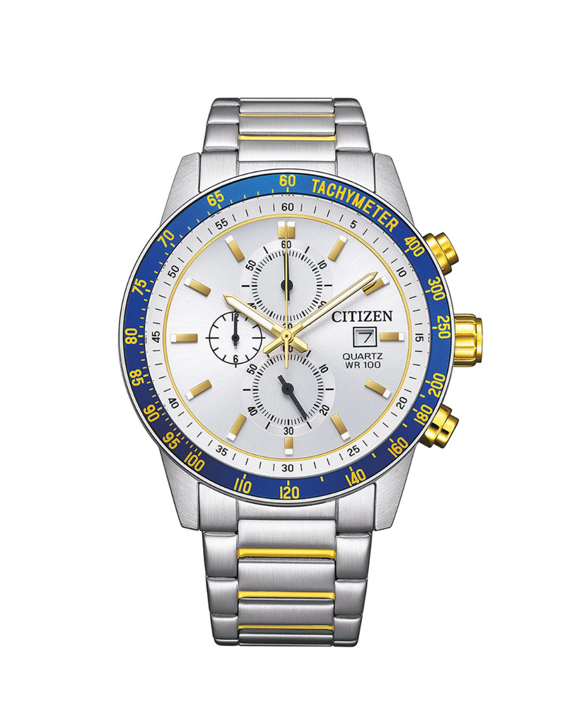 The Citizen AN3686-53A is a men’s 44mm stainless steel chronograph watch with a silver dial, yellow accents, and a blue tachymeter bezel. It features a date display, quartz movement, mineral crystal, and is water-resistant up to 100 meters. Perfect for both casual and formal wear.