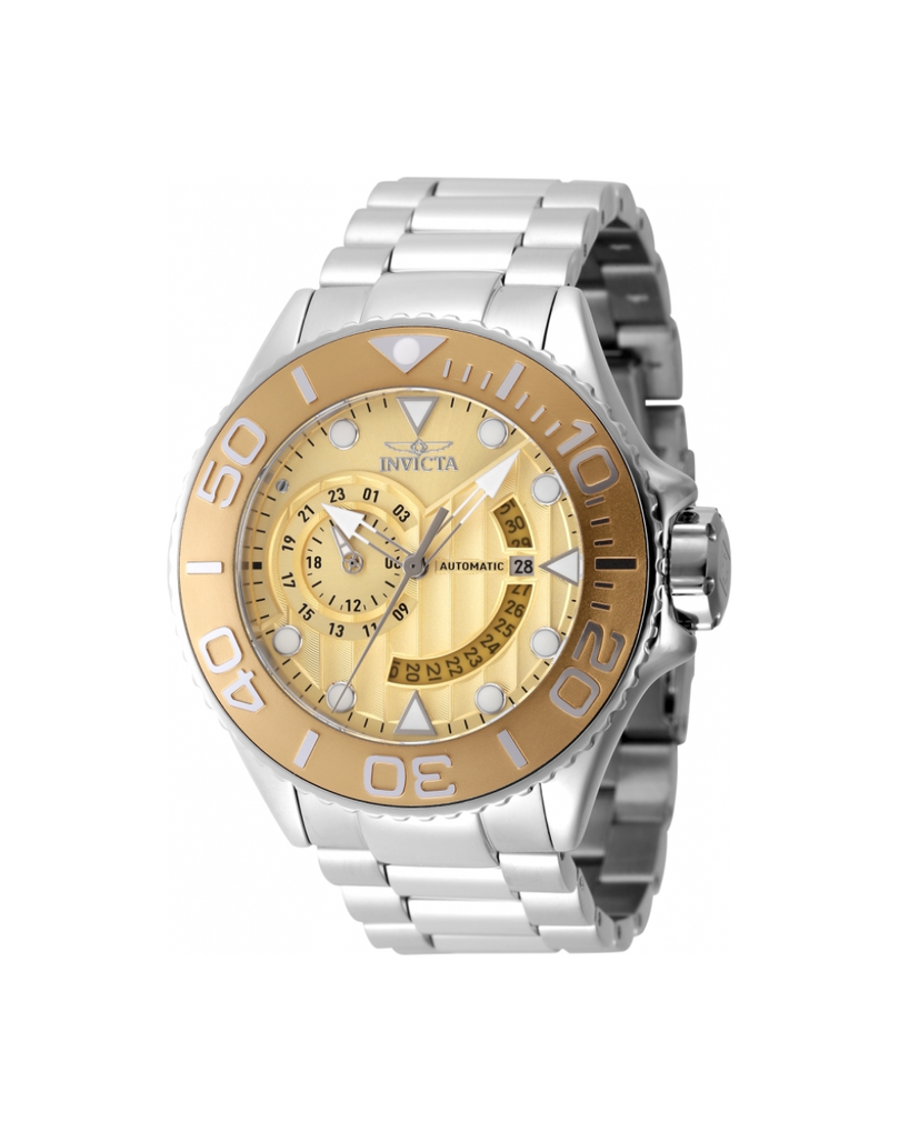 The Invicta Grand Diver Men’s Watch (47543) features a bold 52 mm stainless steel and aluminium case, a gold-tone dial, and a silver-tone stainless steel bracelet. Powered by a Japanese automatic movement (Caliber Miyota 8217) with a 24-hour/GMT sub-dial, it delivers reliable mechanical performance with classic Grand Diver styling. Water resistant to 300 m, this model is built for diving while still working as a standout everyday statement piece.