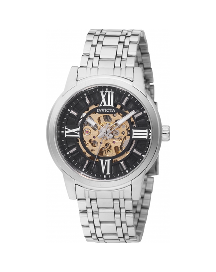 The Invicta Objet d’Art Men’s Watch (41 mm) showcases an open-heart skeleton dial that reveals the automatic movement beneath. Featuring a gold-tone stainless steel case with a matching bracelet, this model blends classic dress styling with mechanical artistry. Designed for everyday sophistication, it is powered by a self-winding automatic movement and offers timeless elegance in a standout skeletonised finish.