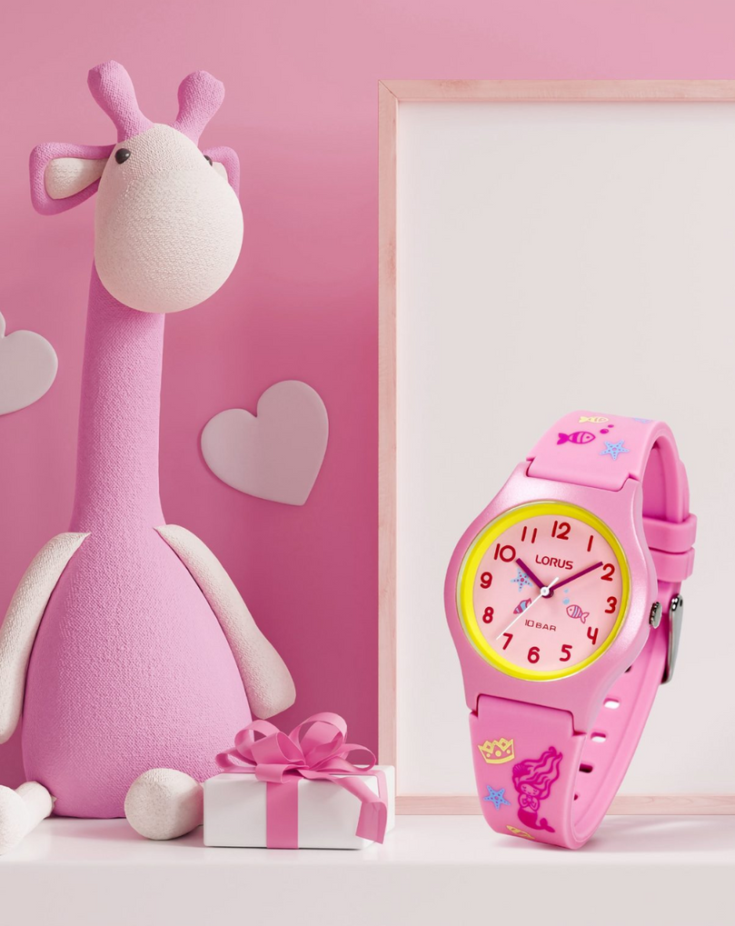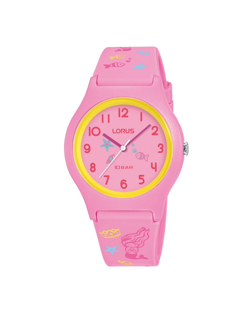 The Lorus RRX49HX9 is a children's analog watch featuring a vibrant pink design with sea-themed graphics, making it both functional and appealing to young wearers.
