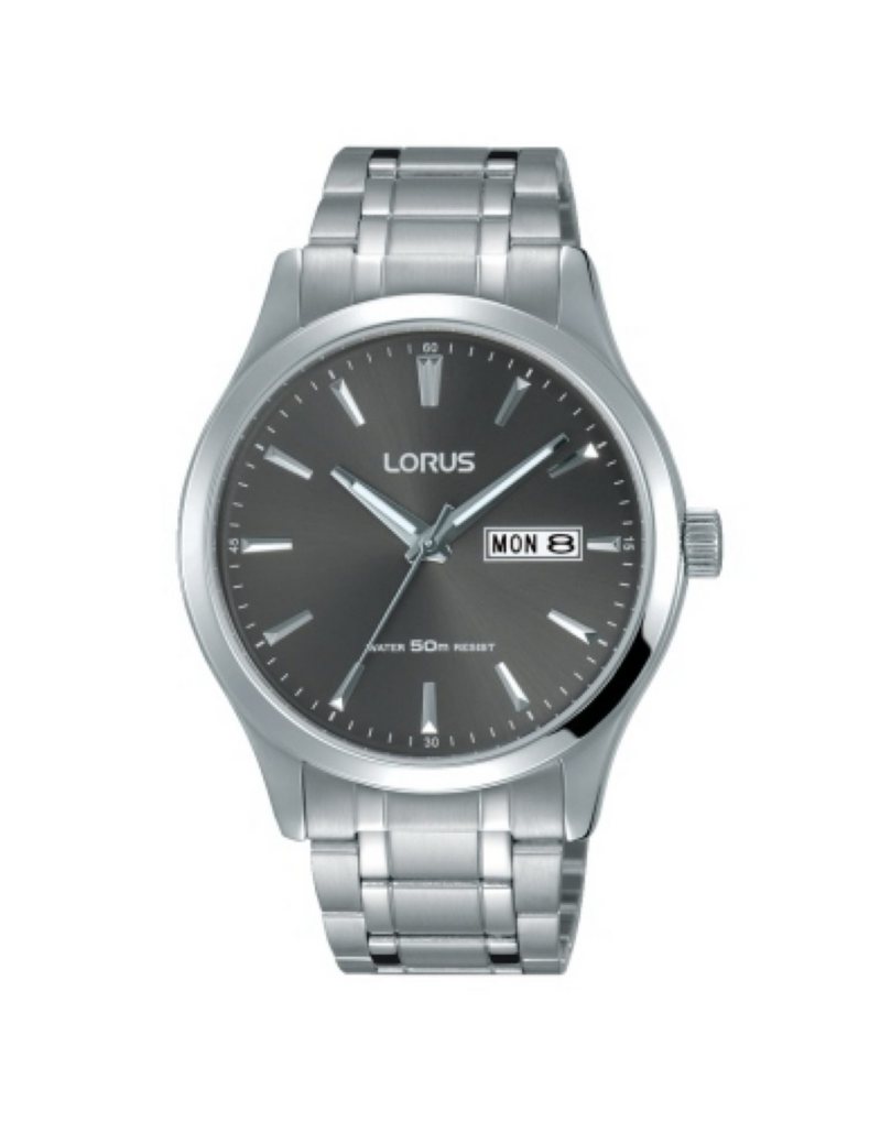 This timepiece features a grey dial complemented by a stainless steel bracelet, offering a refined appearance suitable for both casual and formal occasions.