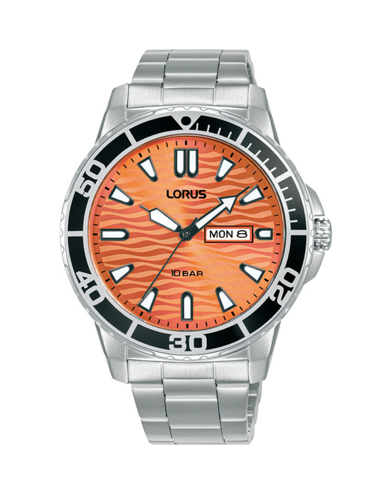 Discover a new level of style and dependability with this dynamic timepiece. A striking dark orange sunray dial with hour, minute, and second hands adds a bold touch, while the date & day feature keeps you organized at a glance. Encased in robust stainless steel with a screw case back and water resistance up to 10 bar, it’s ready for everyday wear and more adventurous pursuits.