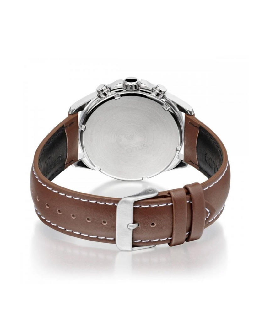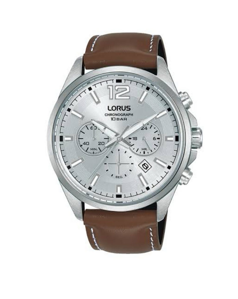 This timepiece features a white sunray dial complemented by silver-tone hands and hour markers, offering a refined appearance suitable for both casual and formal occasions. The chronograph function allows for precise time measurement, and the date display adds to its practicality. The dark brown leather strap ensures comfort and durability.