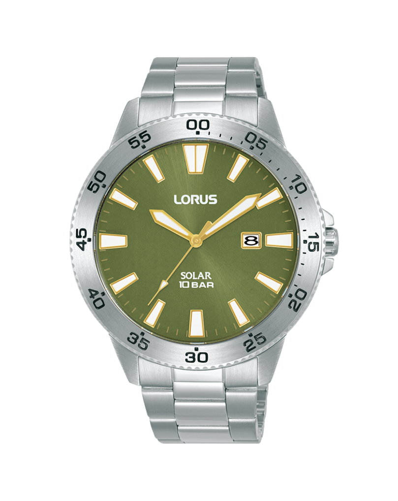 The Lorus RX343AX-9 delivers outdoor-ready reliability and sporty elegance. Featuring a 43 mm stainless steel case, vibrant green sunburst dial, and solar-powered movement (Caliber AS32), it offers continuous power from any light source. Finished with a date display, 100 m water resistance, and a slim profile beneath mineral crystal, this watch blends sporty practicality with sleek, everyday wearability.