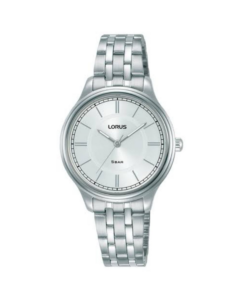 This timepiece features a silver sunray dial housed in a 32mm stainless steel case, complemented by a stainless steel bracelet, offering a timeless and elegant look. The watch is powered by a reliable quartz movement and is water-resistant up to 50 meters, making it suitable for everyday wear.