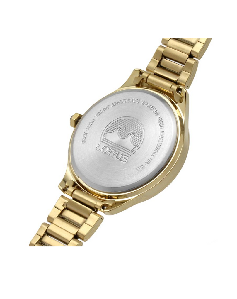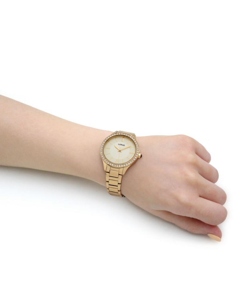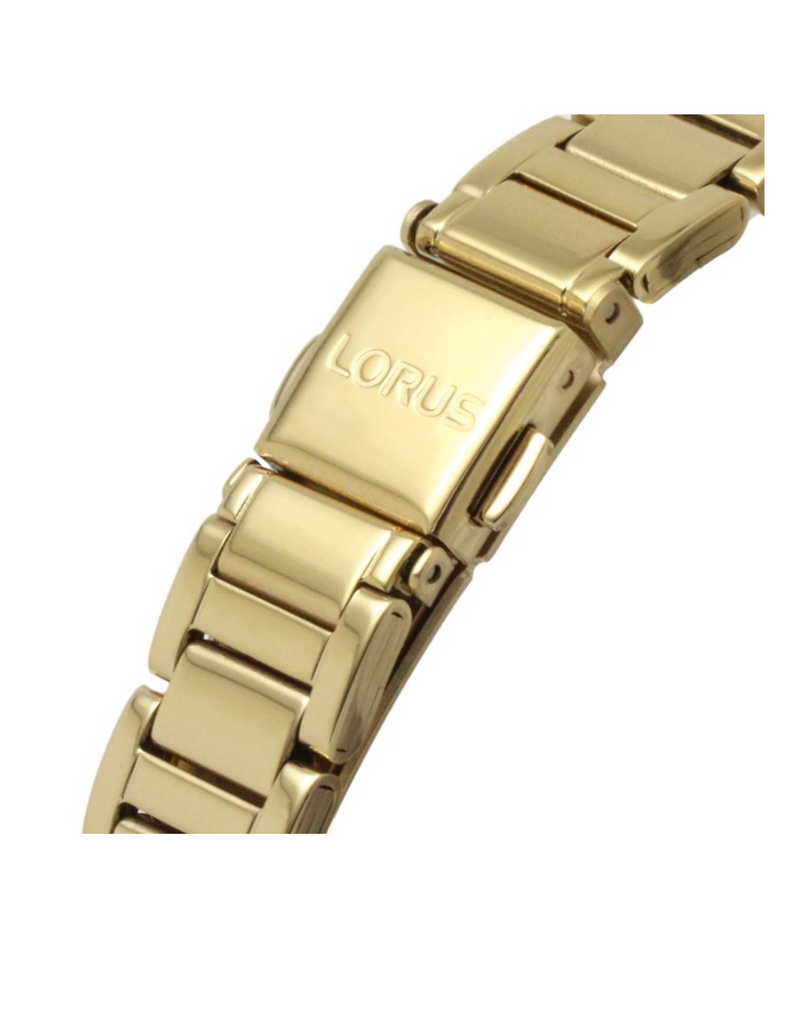 The Lorus RG232UX9 is a ladies' watch featuring a 33mm gold-tone stainless steel case and bracelet, complemented by a champagne sunray dial. It operates on a quartz movement and is water-resistant up to 50 meters.