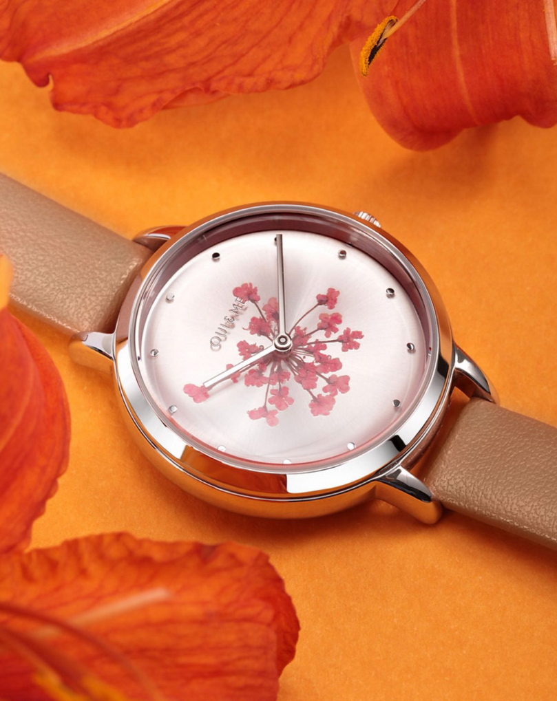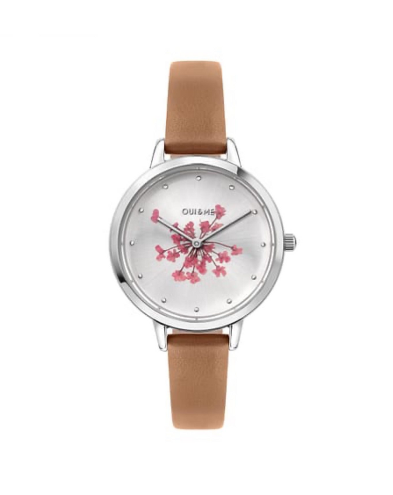 The Oui & Me Cherry Blossom “Fleurette” ME010248 is a delicate ladies' watch featuring a 34mm rose gold-tone case, a floral-inspired dial, and a soft leather strap. With its elegant design and quartz movement, this timepiece embodies femininity and grace, perfect for everyday sophistication.