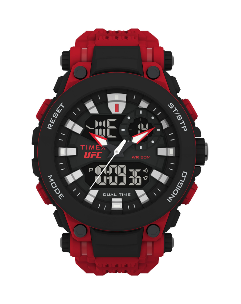 Introducing the TIMEX UFC Impact 50mm Resin Strap Watch - TW5M53000, a bold, sport-inspired timepiece designed for durability and performance. With a 50mm resin case and an analog-digital display, it blends precision and strength for athletes and adventurers alike.