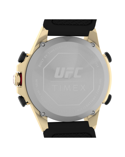 Introducing the TIMEX UFC Kick 49mm Resin Strap Watch - TW2V86600, a bold, performance-driven timepiece shaped for action. With its substantial 49mm gold-tone case, rugged black strap and large digital layout, this watch is built to perform both in the gym and in everyday life.