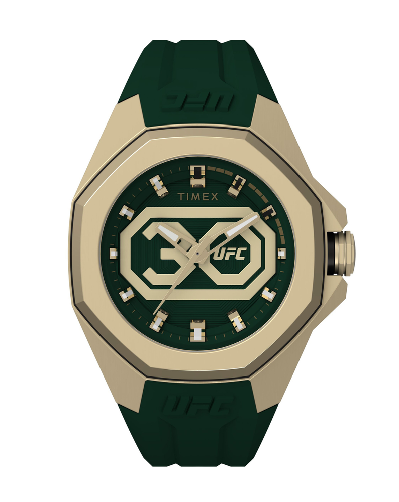 Introducing the TIMEX UFC Pro 30th Anniversary Watch – TW2V90100, a bold tribute piece built to mark the legacy of combat sport. Featuring a green dial with a prominent gold-tone “30” logo, paired with a gold-tone case and green strap, it’s crafted to make a statement.