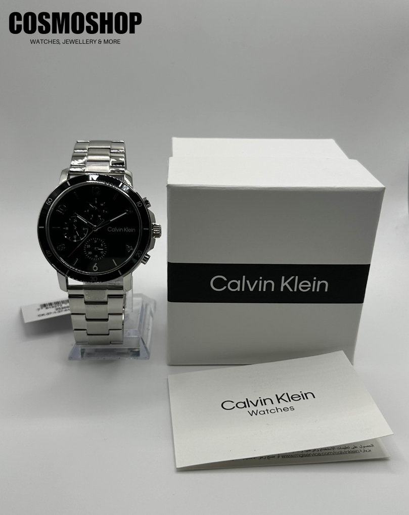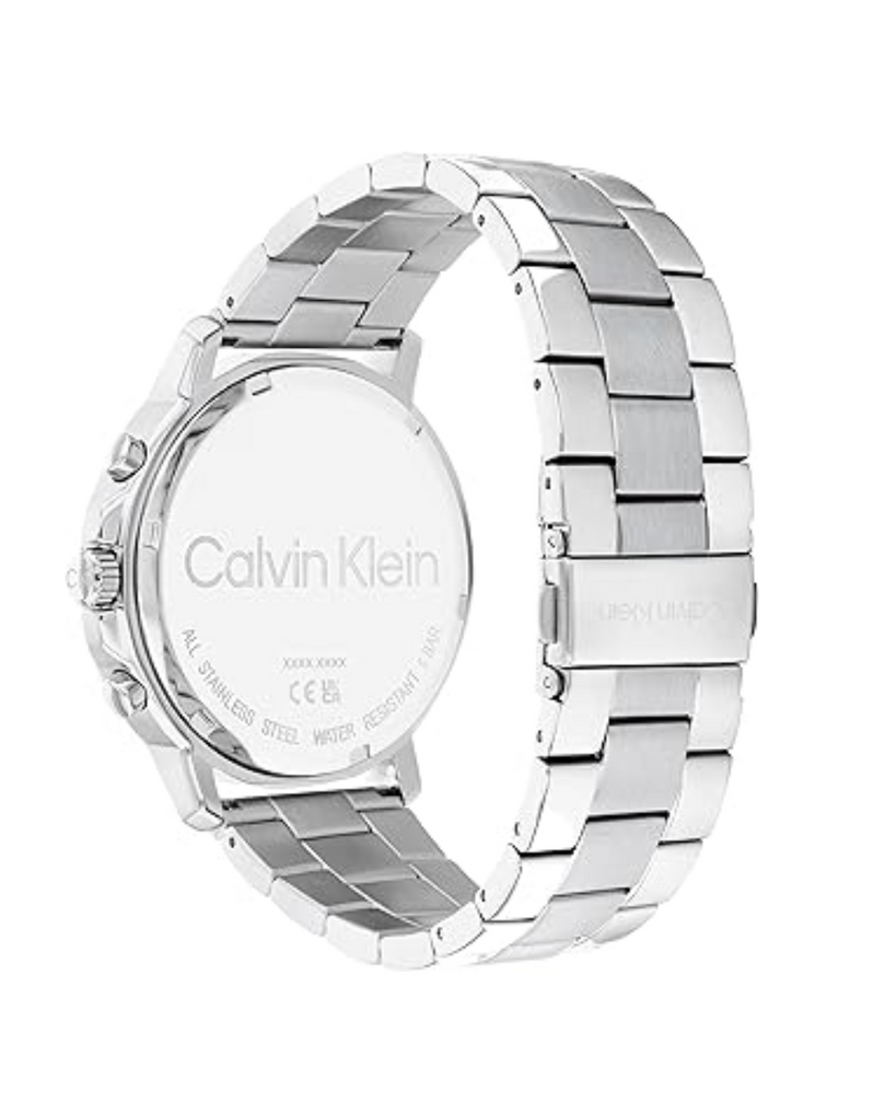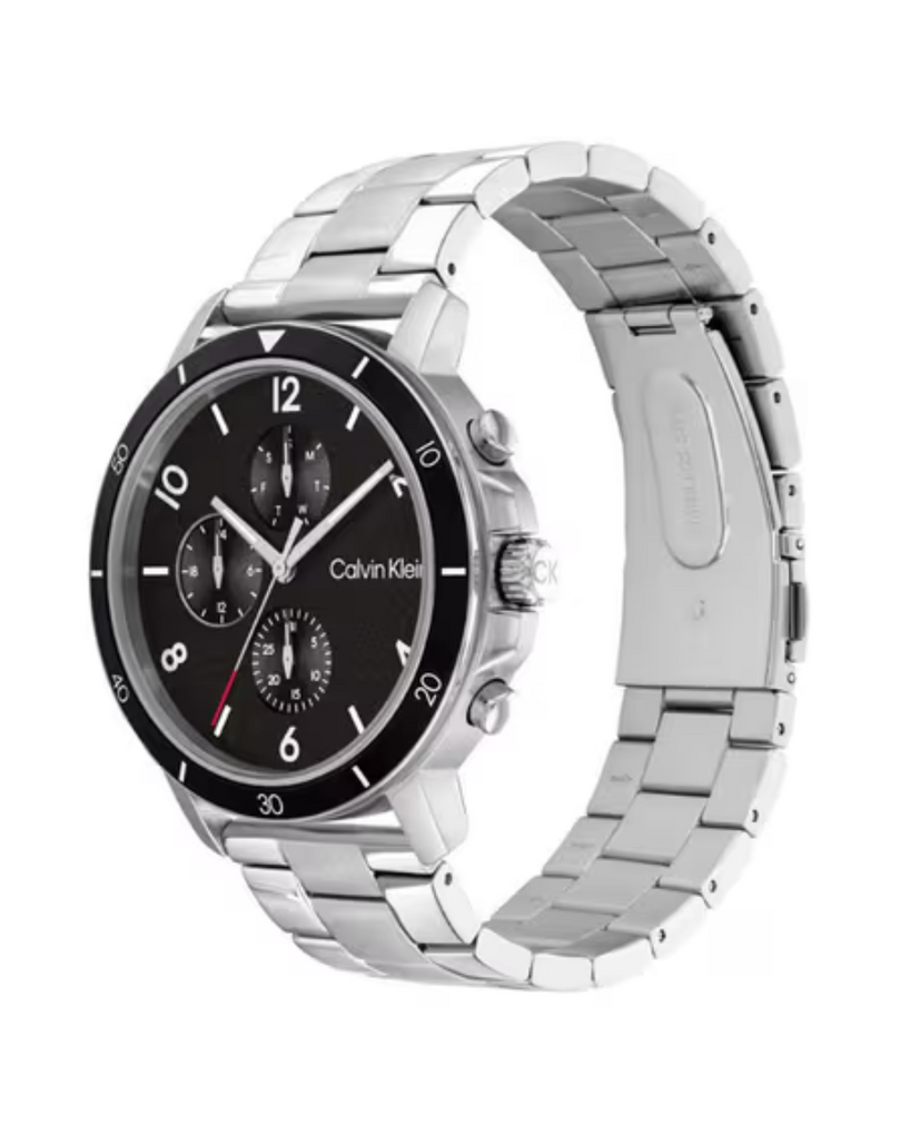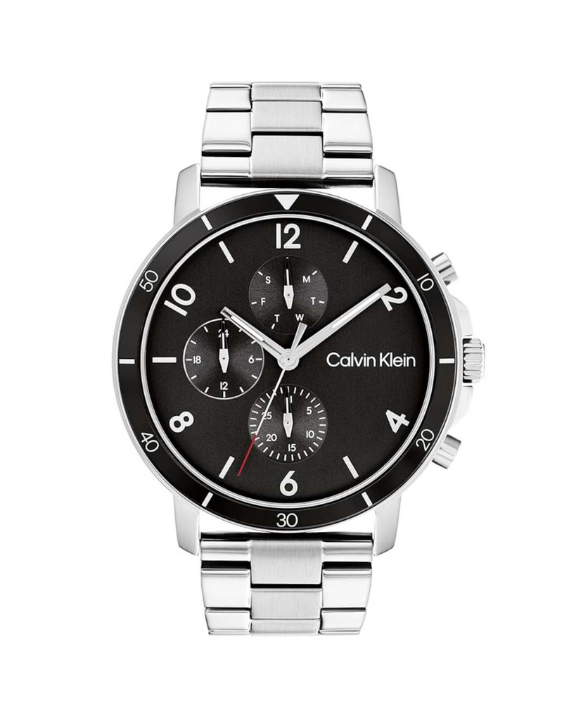 The Calvin Klein Gauge Sport Men's Watch (Model: CK25200067) features a sleek 46mm stainless steel case, a black brushed dial, and a durable stainless steel bracelet. With multifunction sub-dials for day, date, and 24-hour time, this quartz-powered watch is water-resistant up to 50 meters, making it a stylish and practical choice for any occasion.