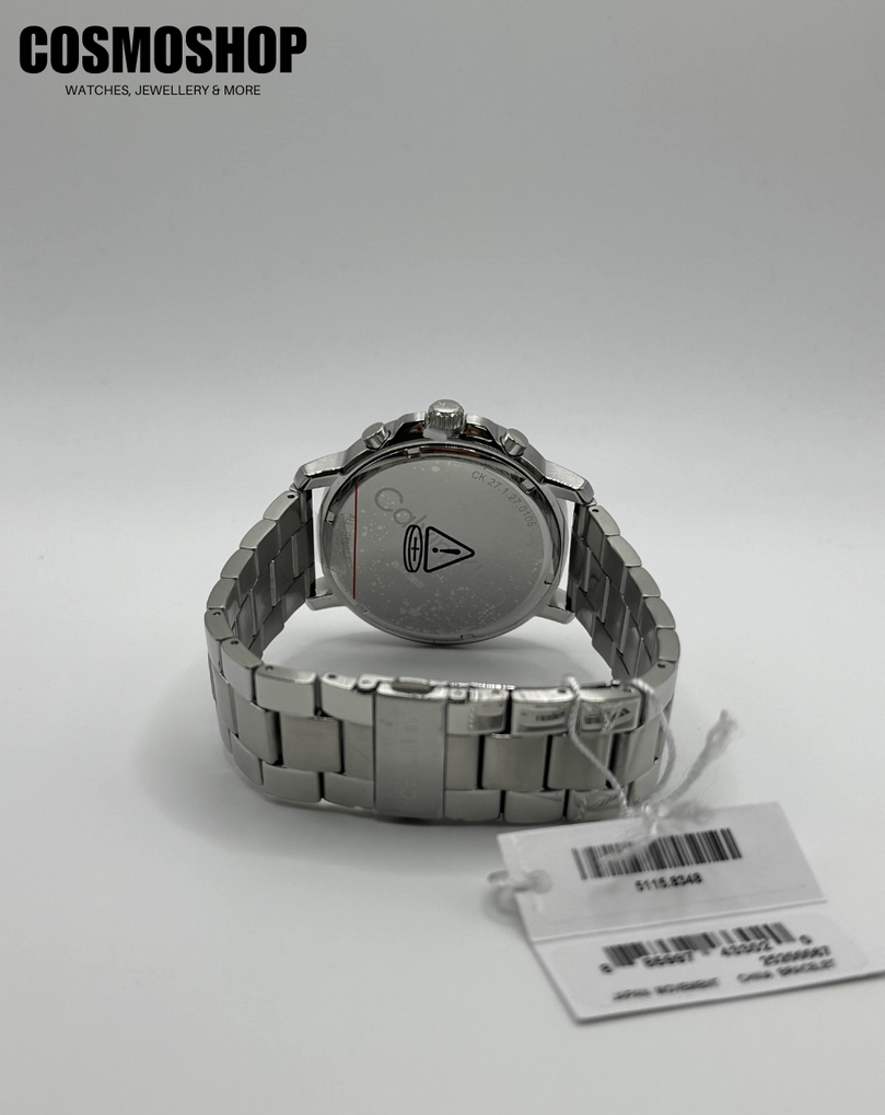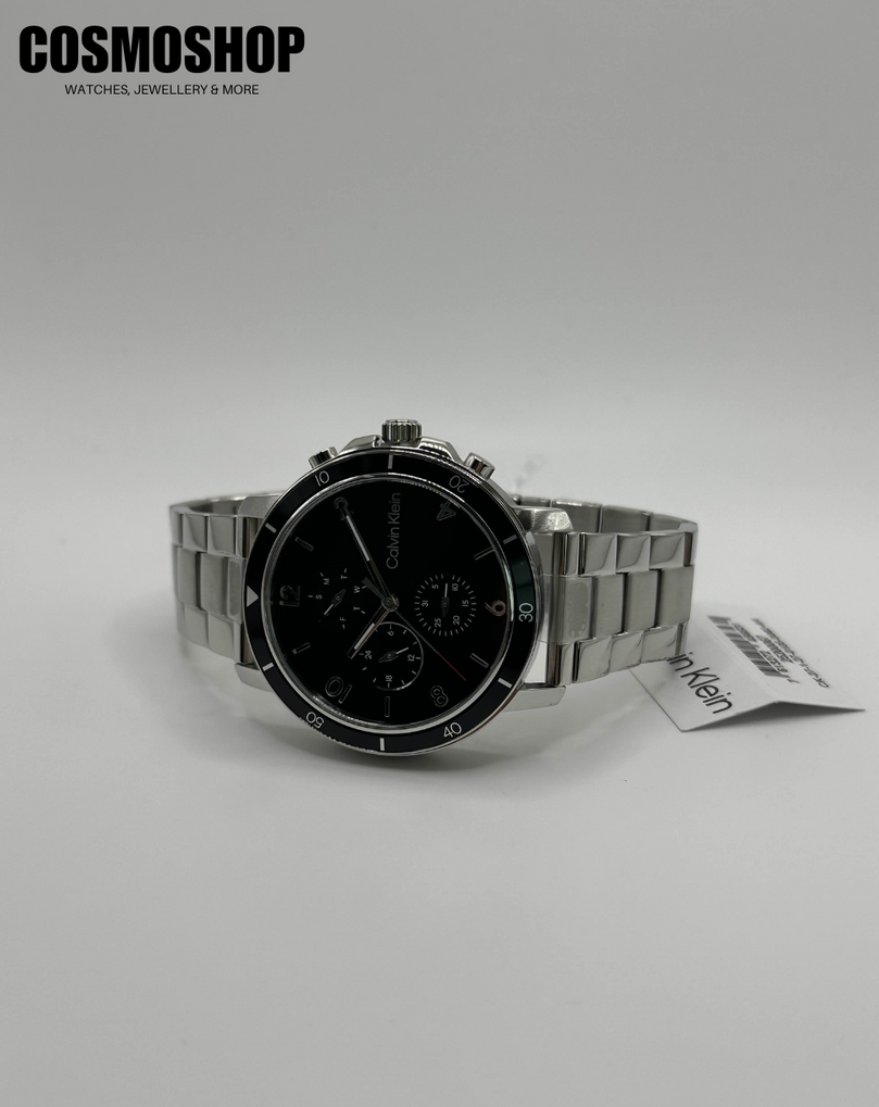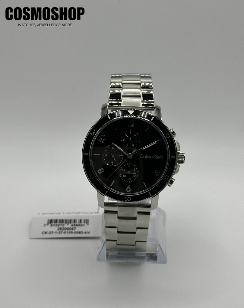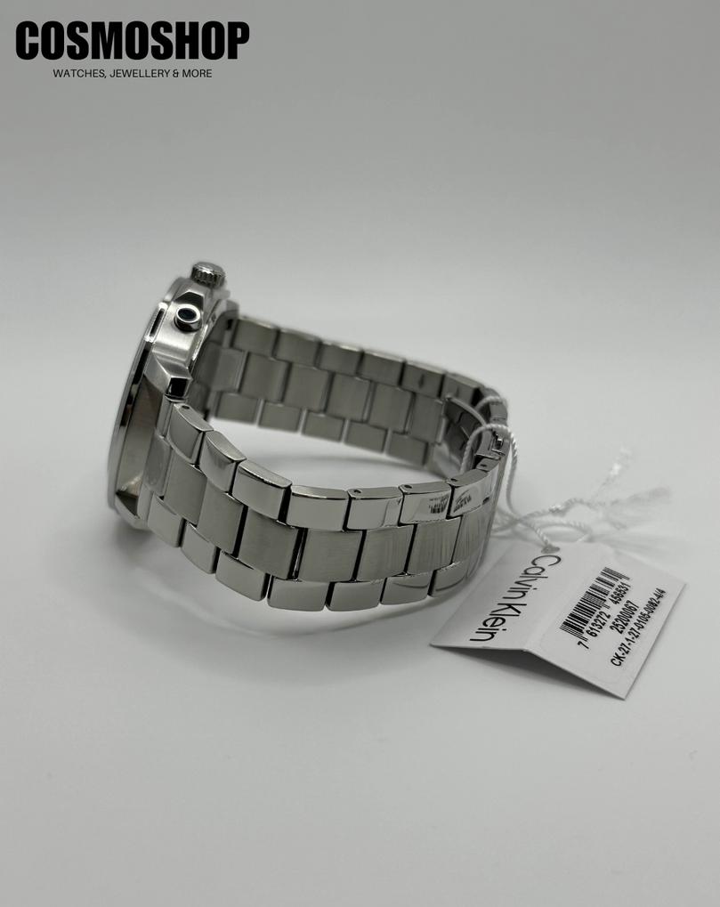 The Calvin Klein Gauge Sport Men's Watch (Model: CK25200067) features a sleek 46mm stainless steel case, a black brushed dial, and a durable stainless steel bracelet. With multifunction sub-dials for day, date, and 24-hour time, this quartz-powered watch is water-resistant up to 50 meters, making it a stylish and practical choice for any occasion.