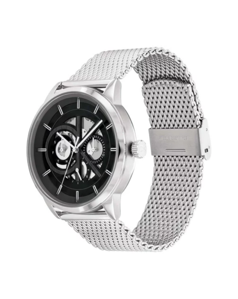 The Calvin Klein Marquee 25200213 is a men's watch that combines modern design with functionality. It features a 43mm stainless steel case and a black and silver dial with a skeleton design, offering a contemporary aesthetic. The watch is powered by a quartz analog movement, ensuring precise timekeeping. It comes with a stainless steel Milanese mesh strap, providing both comfort and style. With a water resistance of up to 30 meters, it is suitable for everyday wear.