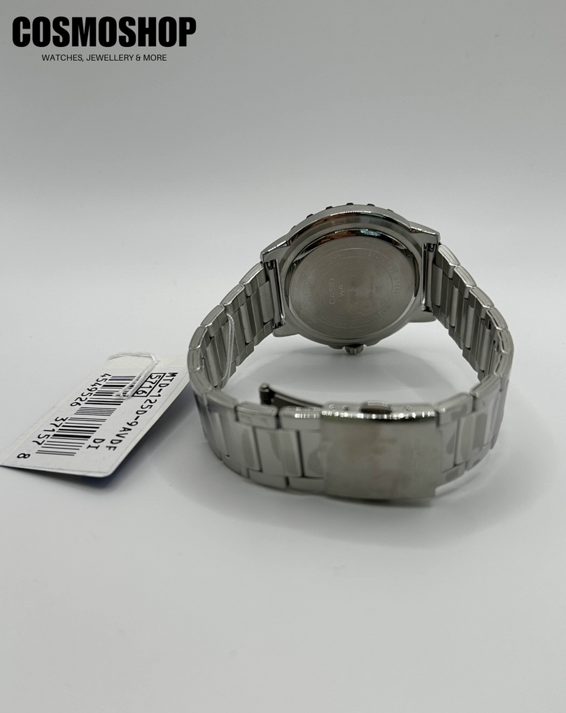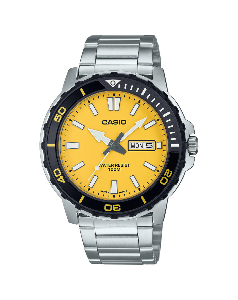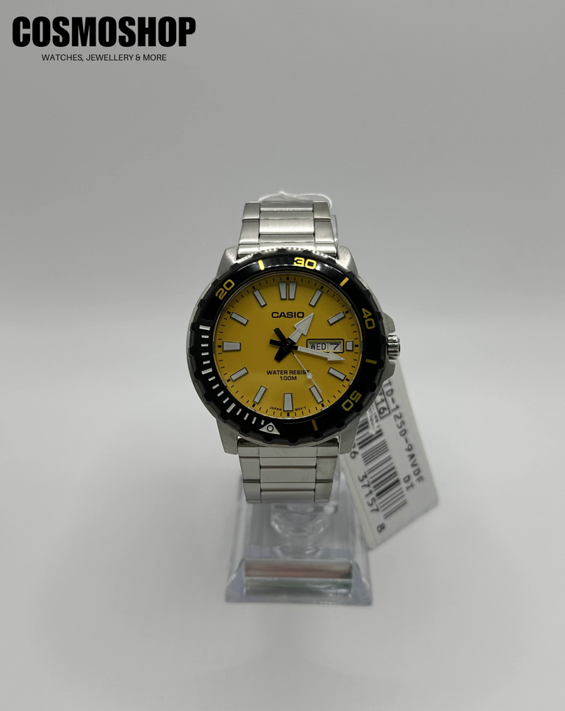 The Casio MTD-125D-9A is a robust and stylish men's watch designed for those who enjoy marine sports or need a durable everyday timepiece. It features a 46.5mm stainless steel case and a distinctive yellow dial with luminous hands and markers for easy readability.
