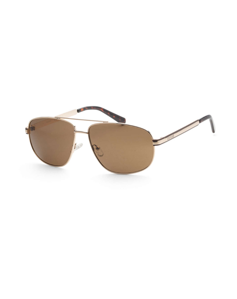 These sunglasses feature a gold-tone metal frame with a full-rim aviator design, complemented by brown-tinted lenses that provide 100% UV protection. The tortoiseshell-patterned temple tips add a touch of sophistication, making them suitable for both casual and formal occasions.