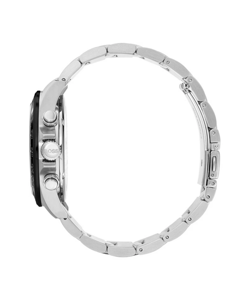The Hugo Boss Hero Chronograph Men's Watch HB1513757 is a sophisticated timepiece that blends modern design with practical functionality. This watch features a black dial complemented by rose gold-tone hands and index hour markers, offering a modern and dynamic look. The chronograph functionality is displayed through sub-dials, and a date window is positioned at 4 o'clock. The two-tone stainless steel bracelet ensures durability and a comfortable fit.