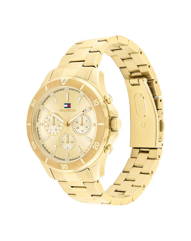 The Tommy Hilfiger Aspen TH1782640 is a women's watch that combines classic design with modern elegance. It features a 38mm gold-tone stainless steel case with a thickness of 10mm, offering a substantial yet refined presence on the wrist. The watch showcases a matching gold-tone dial, complemented by gold-tone hands and hour markers, embodying a cohesive and sophisticated aesthetic. A mineral crystal protects the dial, ensuring durability and clarity.
