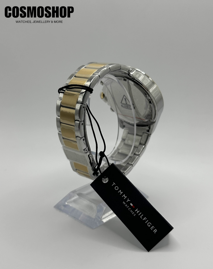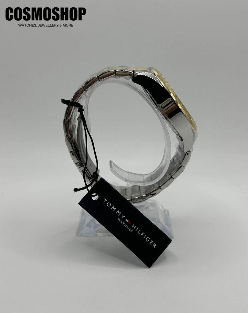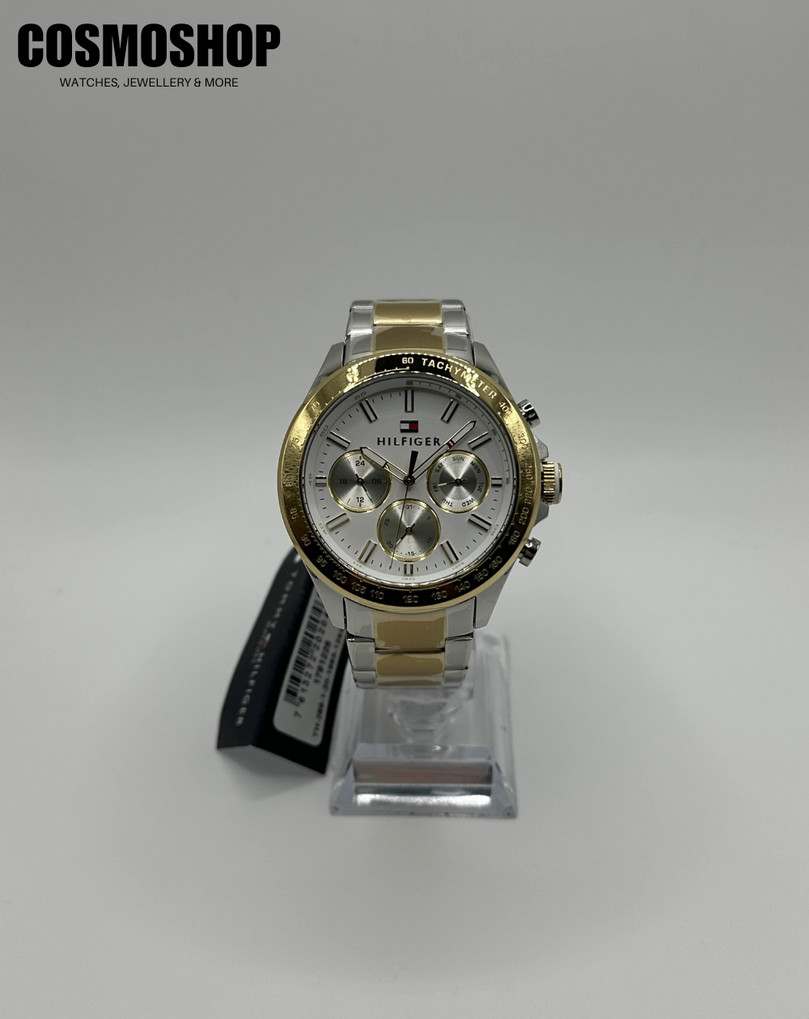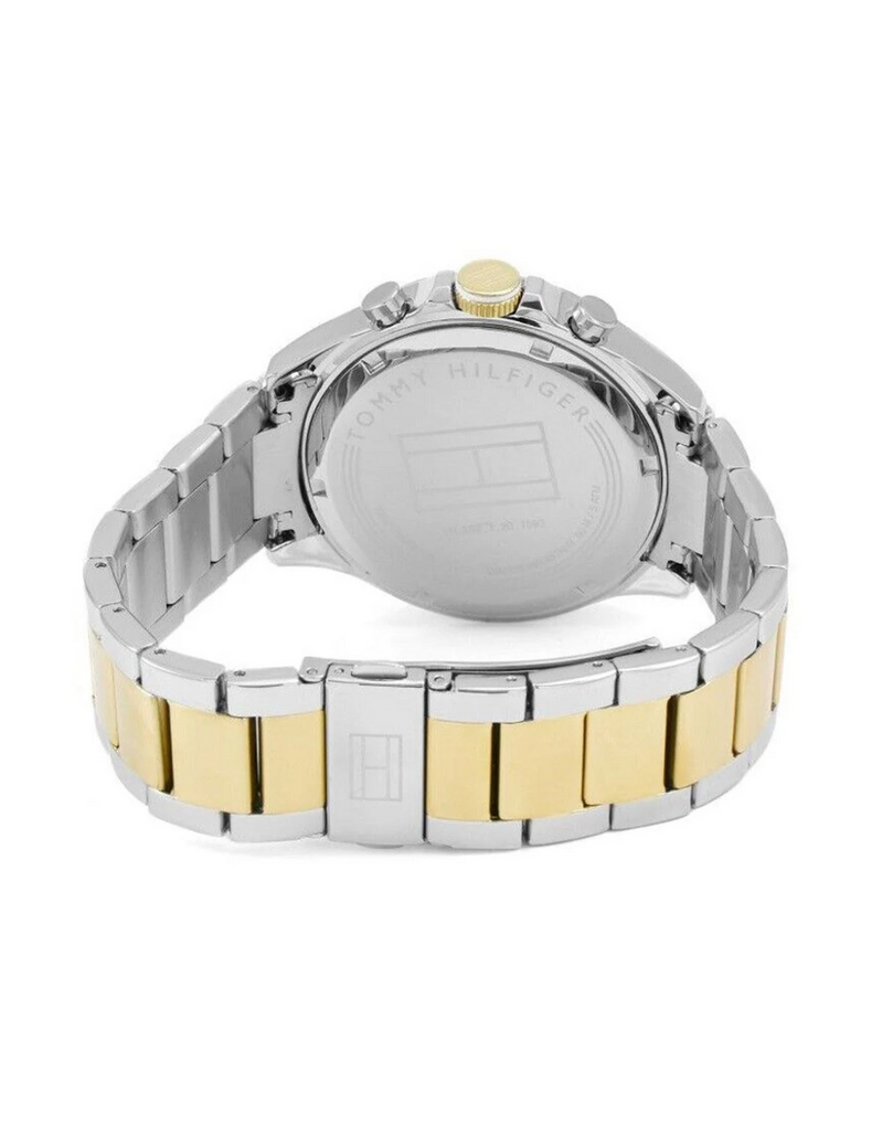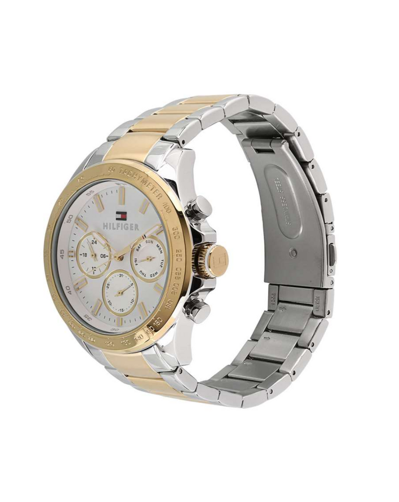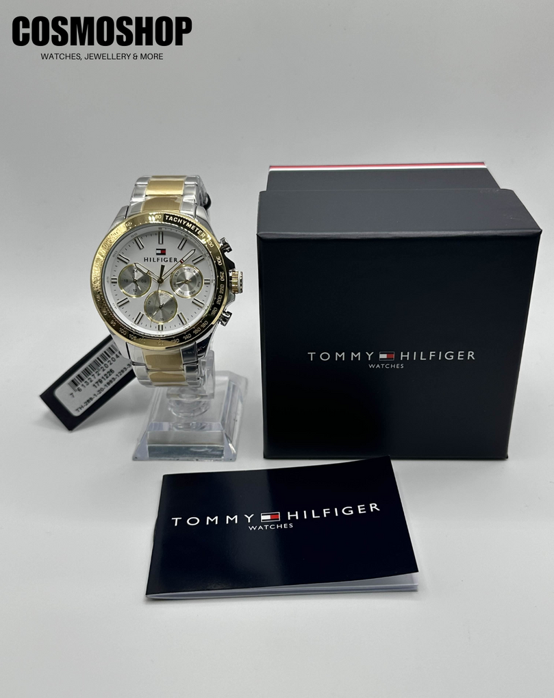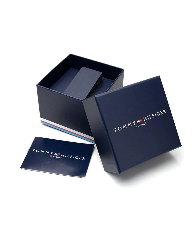 The Tommy Hilfiger Hudson Chronograph Quartz Men's Watch (Model: 1791226) features a sleek silver-tone dial with chronograph functionality, making it both stylish and practical. Its polished stainless steel case and bracelet provide a modern and sophisticated look, while the quartz movement ensures reliable timekeeping. The minimalist design is accented by subtle branding and functional sub-dials, ideal for those seeking a versatile and fashionable accessory.